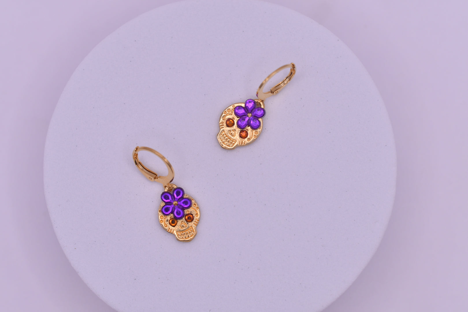 Huggies de acero inoxidable con dijes de chapa de oro, detalles en cristales y acrílico.