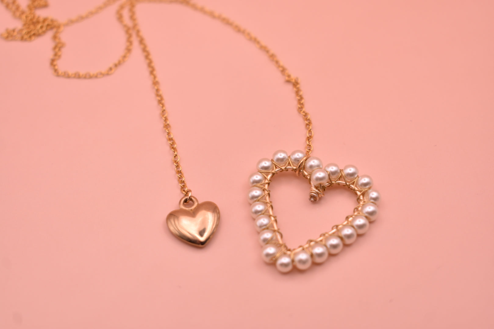 Cadena chapa de oro y dijes en chapa de oro con perlas artificiales y acrílico.