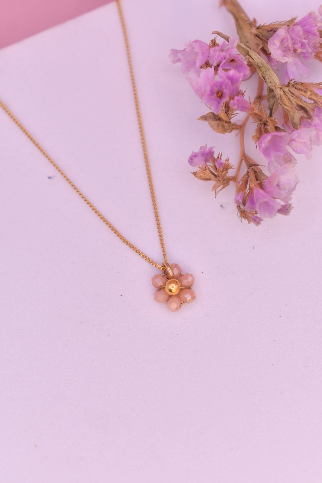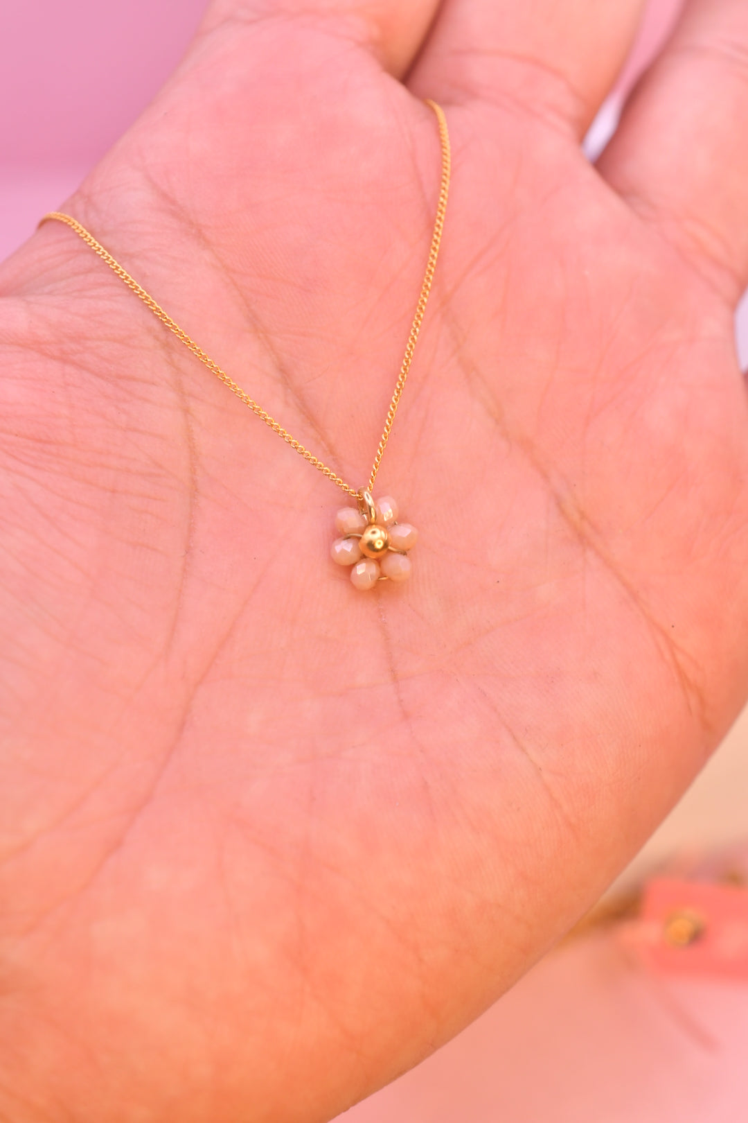 Dije mini de florecita elaborada con cristales y cuentas chapadas en oro 18k con cadena chapada en oro.