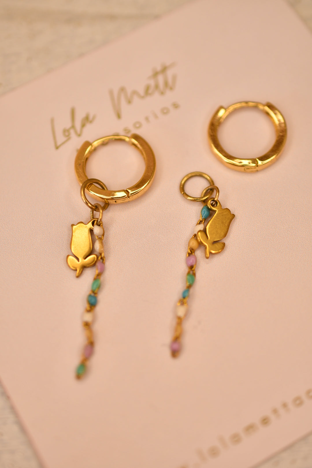 Huggies con dije de tulipan y cadena de colores que puedes usar o retirar para tener dos formas de usar tus aretes!