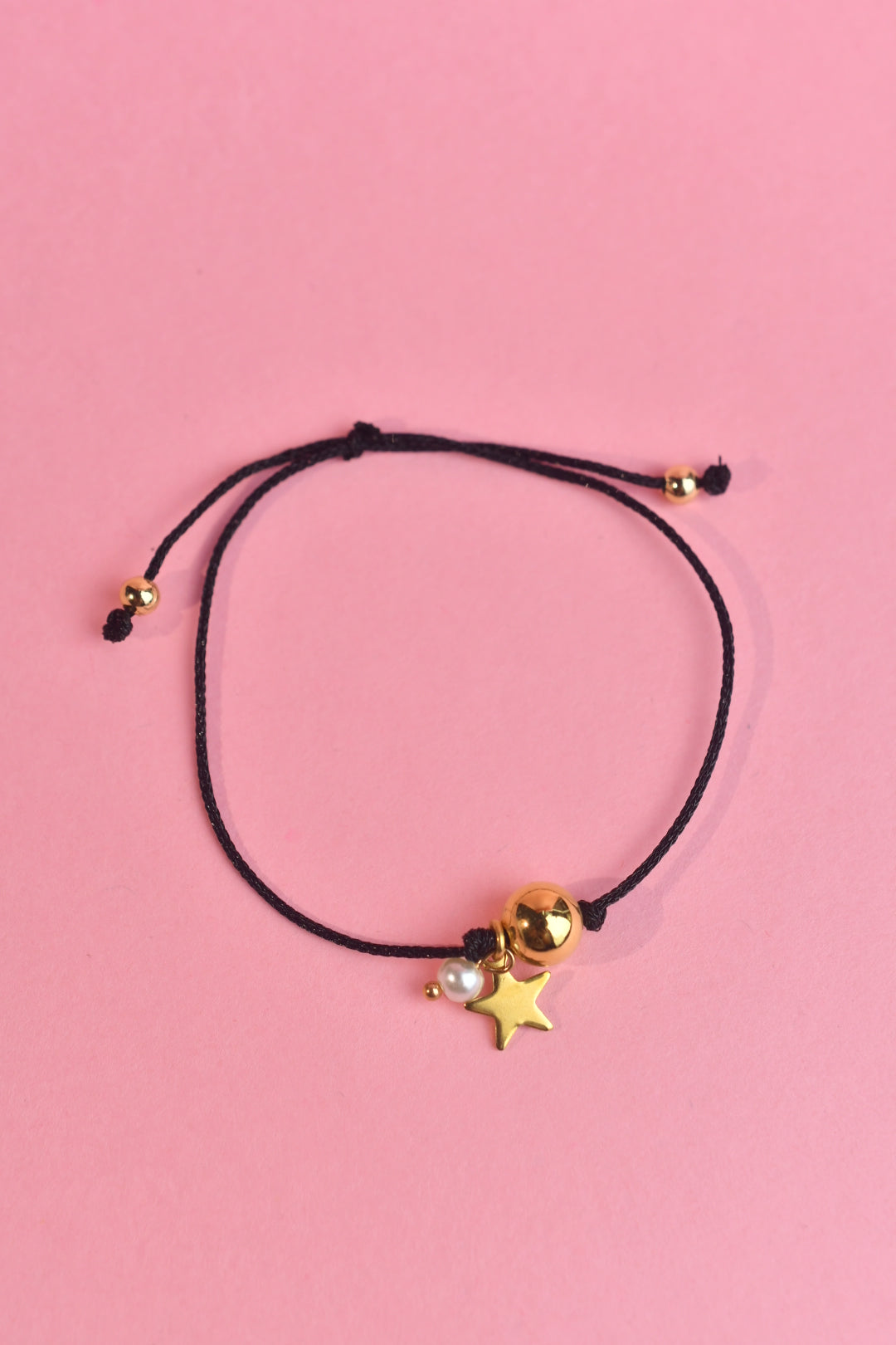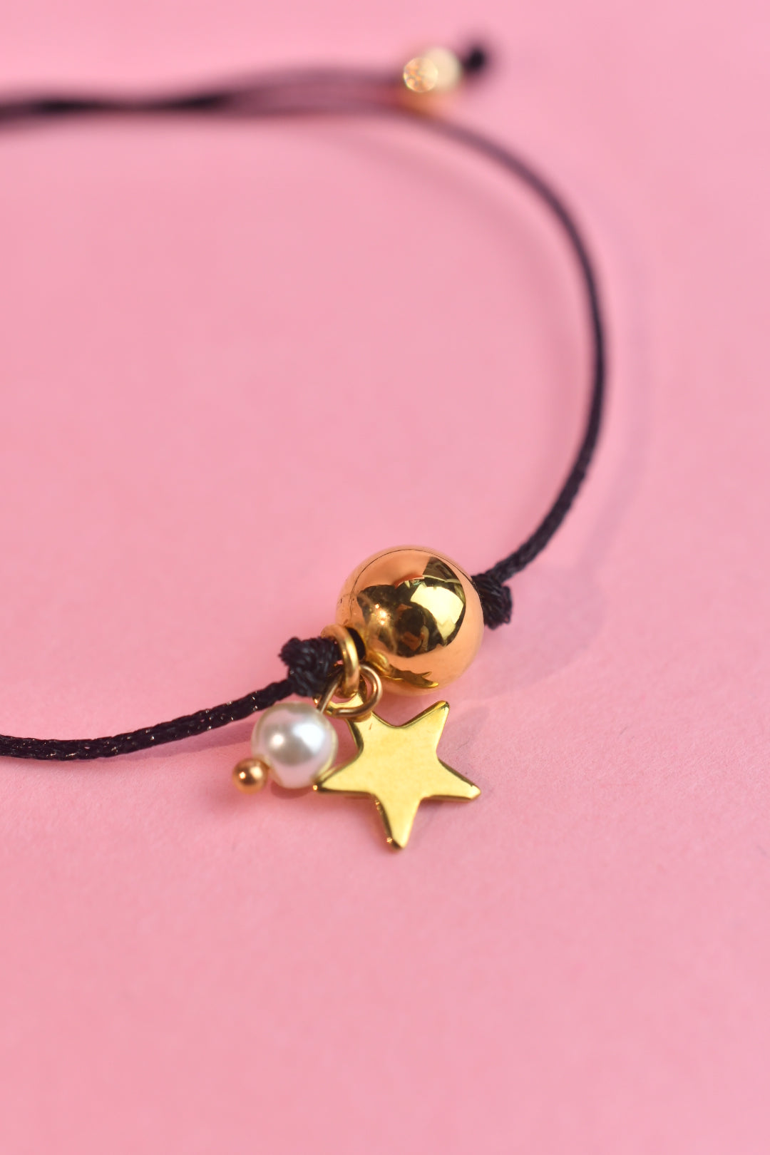 Pulsera de hilo chino con dijes de acero inoxidable, cristales y cuentas chapadas de oro 18k.