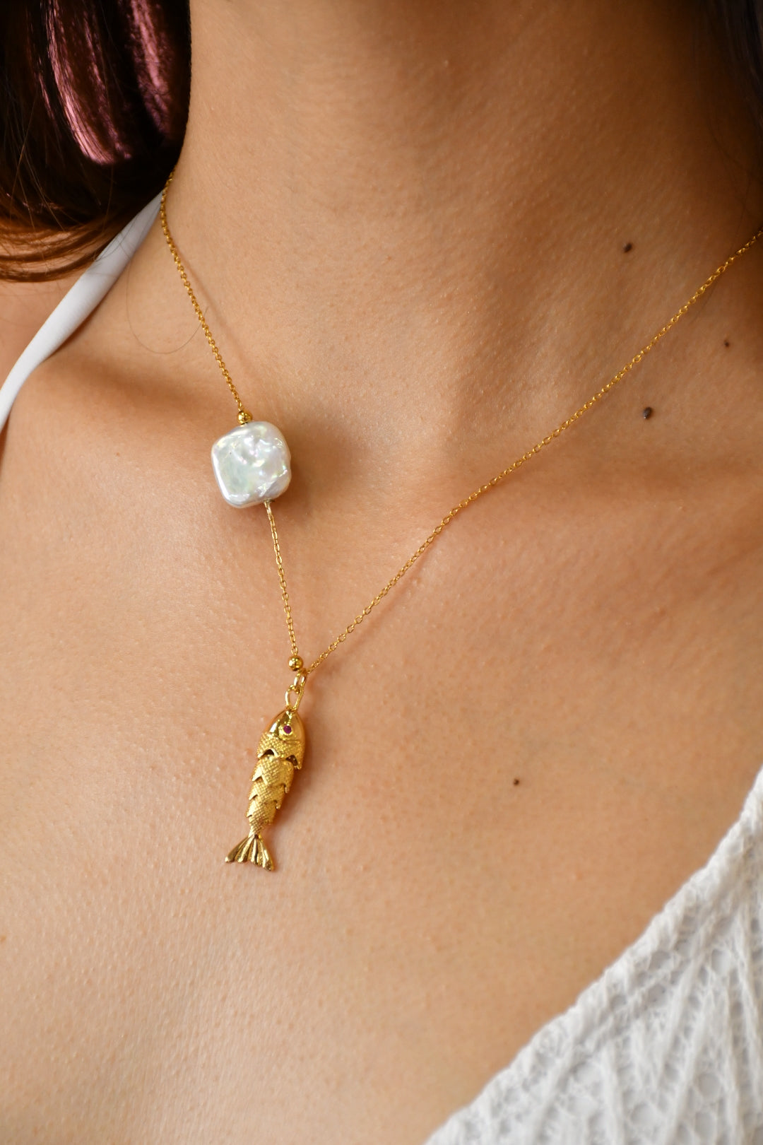 Cadena de acero inoxidable, dijes de chapa de oro en forma de pez articulado y perla de río.
